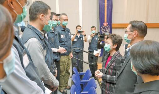 林鄭在民安隊處長羅仁禮陪同下探訪該隊總部,與約50名參與設立及管理檢疫中心的隊員見面。林鄭表示,隨入住檢疫中心的人數上升,民安隊管理檢疫中心的工作量亦日益繁重,感謝民安隊人員日以繼夜辛勞工作,努力為接受檢疫的人士提供所需支援。她又讚揚民安隊一直在抗疫前線堅守崗位,體現民安隊「救急扶危,服務社會」的宗旨,為公共衛生作出重要貢獻。