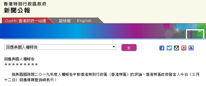 【香港商报网讯】香港特别行政区政府官网3月12日发布新闻公告回應美國人權報告。