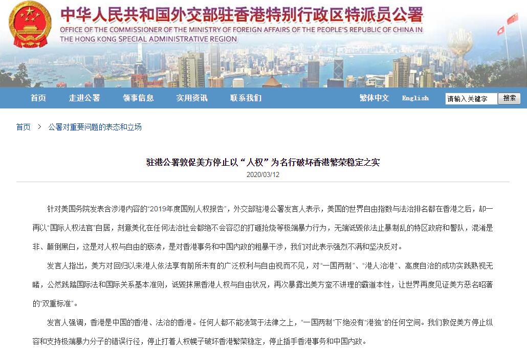 【香港商报网讯】针对美国务院发表含涉港内容的“2019年度国别人权报告”,外交部驻港公署发言人表示,美国的世界自由指数与法治排名都在香港之后,却一再以“国际人权法官”自居,刻意美化在任何法治社会都绝不会容忍的打砸抢烧等极端暴力行为,无端诋毁依法止暴制乱的特区政府和警队,混淆是非、颠倒黑白,这是对人权与自由的亵渎,是对香港事务和中国内政的粗暴干涉,我们对此表示强烈不满和坚决反对。