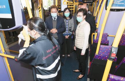 林鄭月娥(右一)在運輸署署長陳美寶(右二)陪同下,視察清潔工人加強巴士車廂清潔及消毒的工作。
