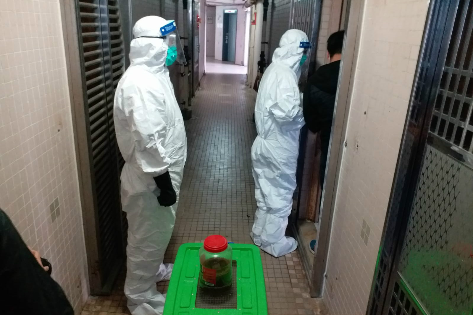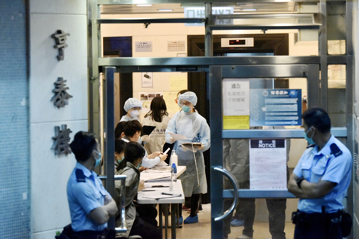 衛生署防護中心人員在大廈內準備文件協助住戶登記,大樓外有警員負責看守。中新社
