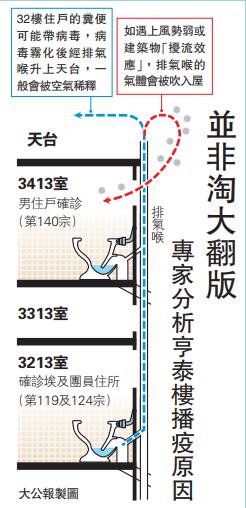 袁國勇表示,專家視察過大廈樓管設計及建築,所有渠、地渠或去水位,設計均沒有問題,但他們發現32樓患者的單位將排氣管截斷了,只用膠紙封住。他說,由於32樓患者先發病,不排除病人的糞便帶有病毒,經氣喉谷上天台,當糞便病毒經霧化再噴出,一旦風勢不大或出現建築物擾流效應,有可能將病毒吹回屋內,但這種效應估計只會影響5層樓。