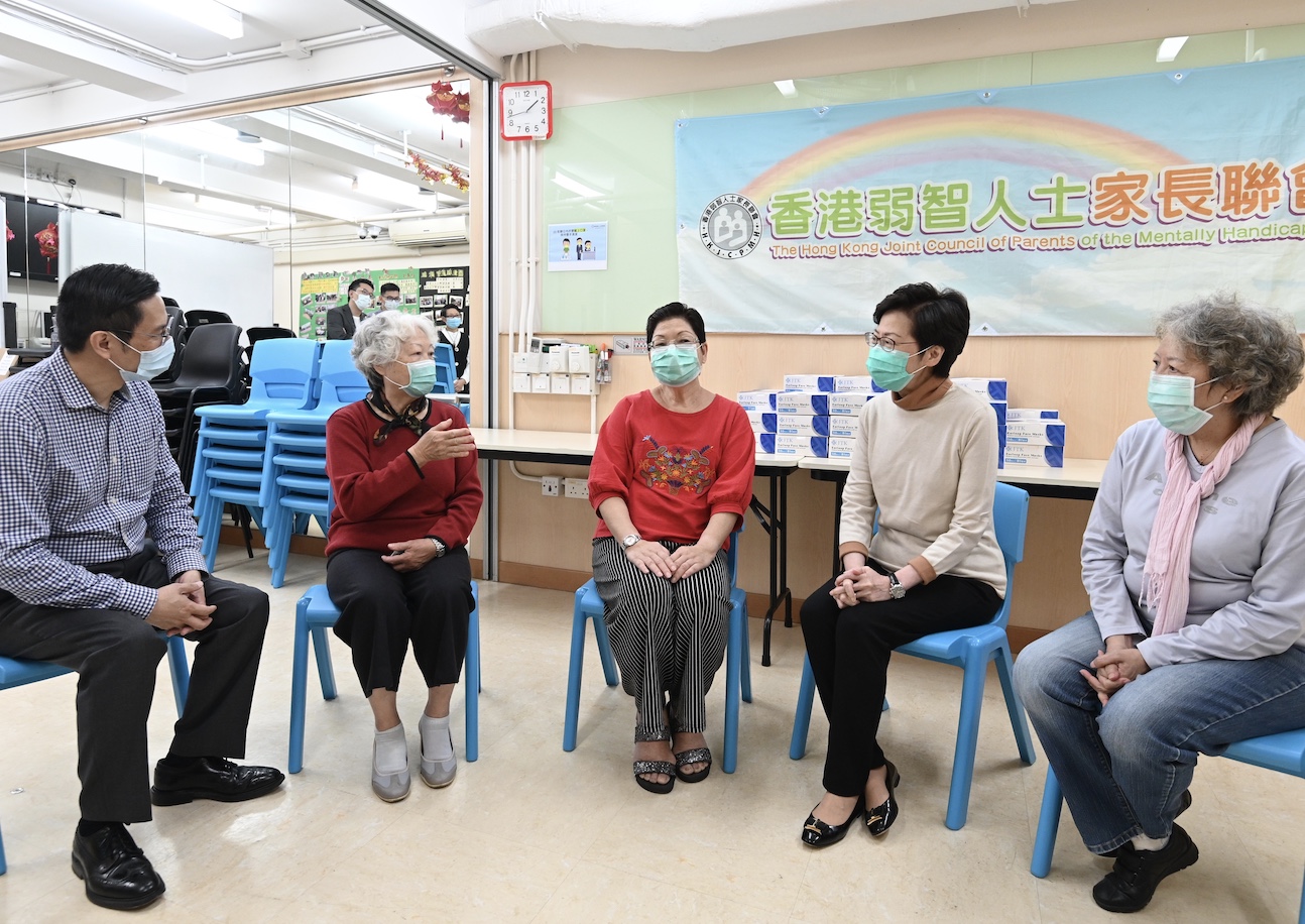 【香港商報网訊】記者戴合聲報道:行政長官林鄭月娥昨日下午在社署副署長林嘉泰陪同下,到深水探訪香港弱智人士家長聯會和勵智協進會兩個組織,與組織的主席和成員交談,了解會員在疫情期間面對的挑戰和對復康服務的意見,並將一些外界早前捐贈予特區政府的口罩轉送給他們。
