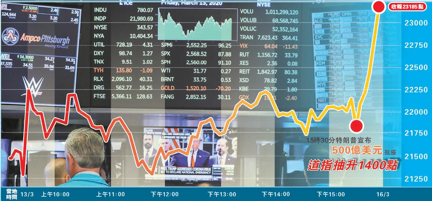 【香港商報网訊】本港時間14日凌晨3時半,美國總統特朗普在白宮舉行有關新型冠狀病毒主題記者會,宣布全國疫情進入「國家緊急狀態」。這項緊急令將釋放500億美元(約3900億港元)聯邦資金,協助受疫情影響的美國公民。消息隨即點燃美股旺盛漲勢,道指半小時內急速抽高逾1440點,收市飆漲1985點,以點數計創有史以來最大升幅,最終以緊貼全日最高位23189點告收;納指與標普漲幅都超過9%,齊創2008年金融海嘯以來最佳單日表現。油價亦抽升5%。近幾天美國長天期公債價格走低、殖利率回升,國際金價出現2011年9月以來最大單周跌勢。