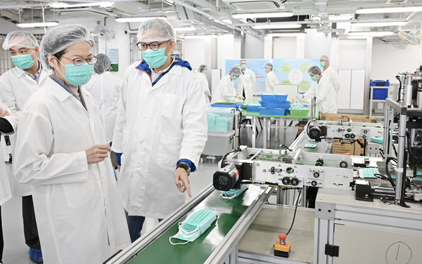 行政長官林鄭月娥(前左)昨日到訪懲教署羅湖懲教所,懲教署署長胡英明在旁介紹口罩增產情況。政府新聞處圖片