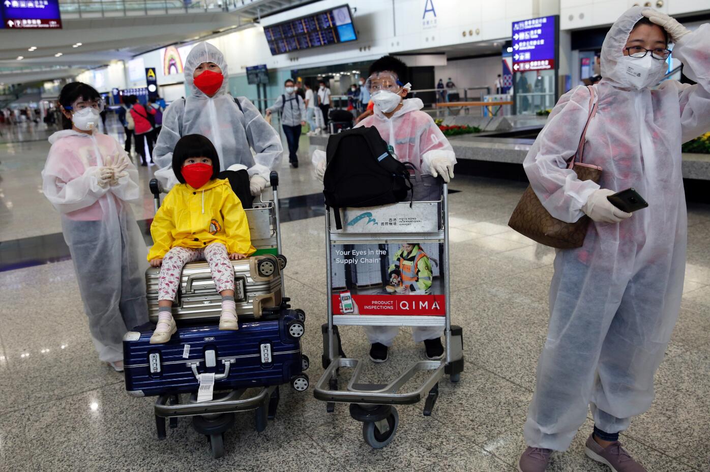 多班由英國倫敦出發的航班昨陸續抵港,機上大部分人士均穿上全副防疫裝備。 路透社