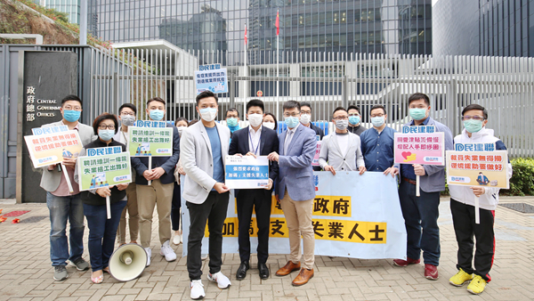民建聯到政府總部請願,要求政府「加碼」支援失業人士措施。