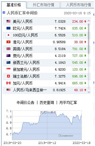 3月18日,美元指数(99.4820, -0.0462, -0.05%)大涨,人民币(7.0046, 0.0114, 0.16%)中间价报7.0328,下调234点,上一交易日中间价报7.0094,在岸人民币上一交易日收报7.0096。