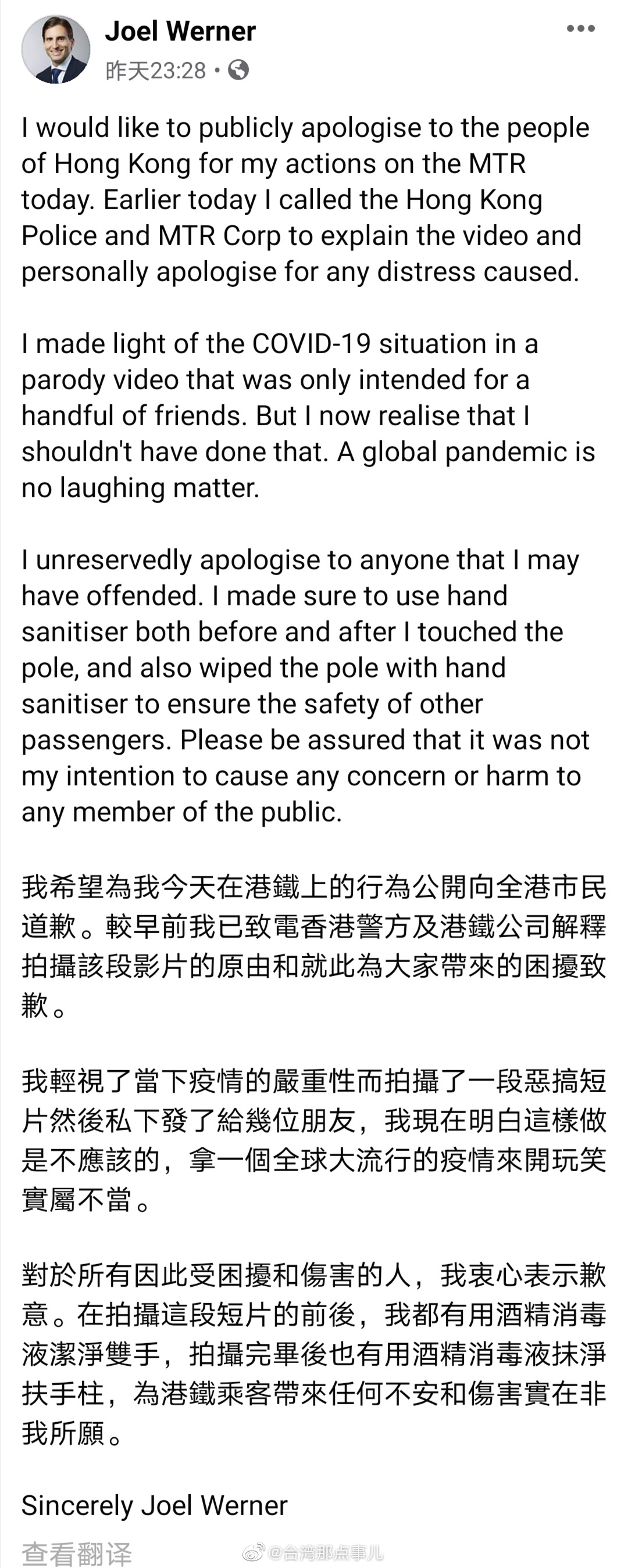 在港鐵「玩口水」的男子Joel Werner,昨日深夜在社交平台就事件致歉,全文如下: