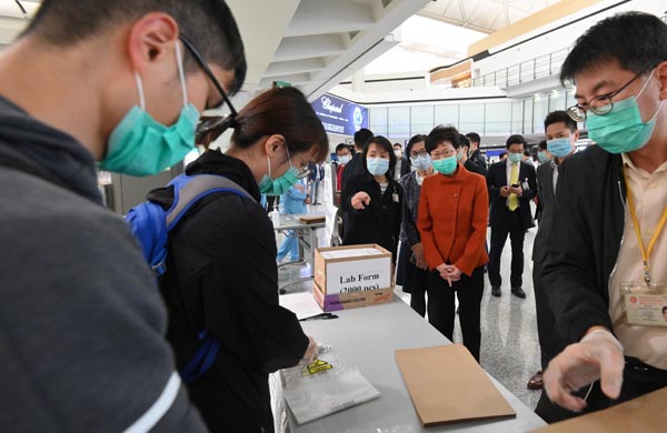 在食衛局局長陳肇始和機管局行政總裁林天福陪同下,林鄭到機場了解了對抵港人士實施強制檢疫全流程,包括抵港人士接受體溫檢測和提交健康申報表;向他們發出檢疫令及為他們戴電子手帶,以確認他們於檢疫期內留在居所;及向他們派發資料包,介紹檢疫令的程序及需要注意的事項。部分抵港人士亦獲發進行病毒測試的樣本瓶,參加「加強化驗室監察計劃」。