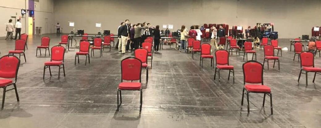 亞博館臨時檢測中心內擺放多張椅供檢測人士休息等候,每張椅均相隔一定距離。 醫管局fb圖片
