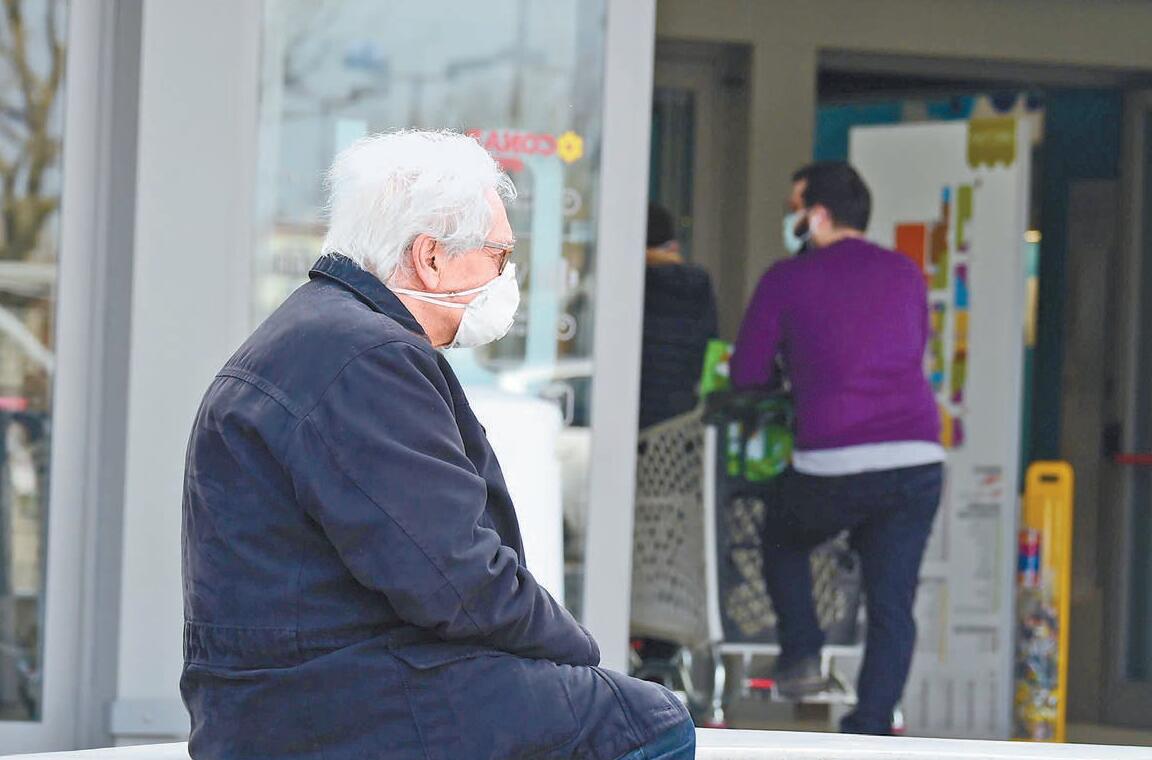 一名意大利老人戴着口罩在超市外排長隊等待購物。 新華社