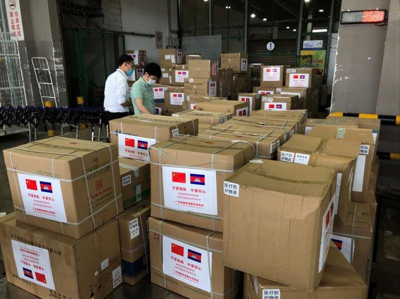 隨同包機一道抵達金邊的還有N95防護口罩、醫用外科口罩、醫用一次性防護服、紅外線體溫槍等柬埔寨急需的抗疫醫療物資。物資包裝紙箱上印著中柬兩國國旗,以及用中柬兩國文字標明的「守望相助、中柬同心」。