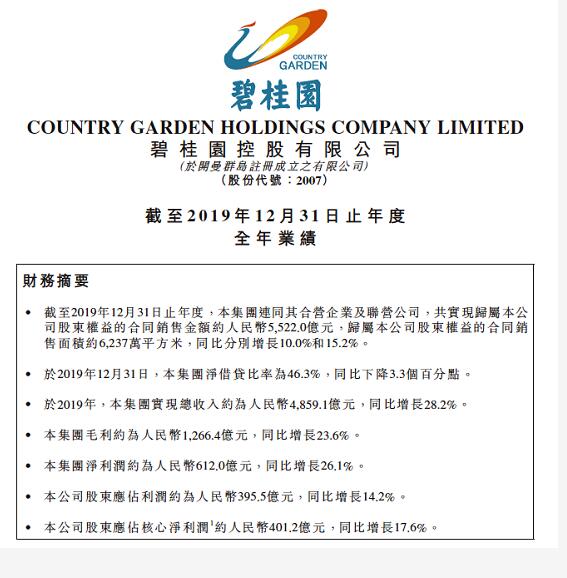 碧桂園凈借貸比率降至46.3% 連續12年維持在70%以下