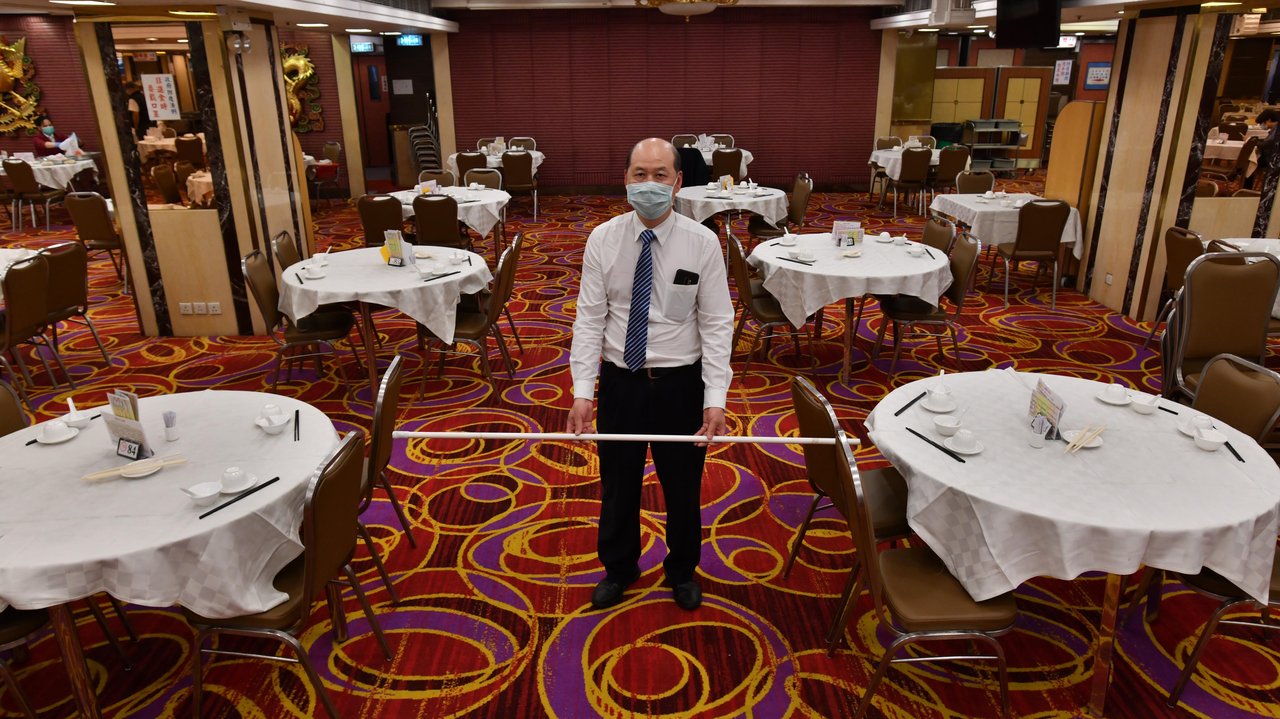 旺角倫敦酒樓譚經理專門鋸1.5米長的膠條量度間距離。 記者 馮俊文攝