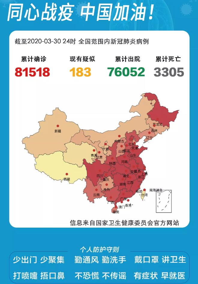 截至3月30日24时,据31个省(自治区、直辖市)和新疆生产建设兵团报告,现有确诊病例2161例(含重症病例528例),现有疑似病例183例。累计确诊病例81518例,累计治愈出院病例76052例,累计死亡病例3305例,累计追踪到密切接触者706017人,尚在医学观察的密切接触者19853人。