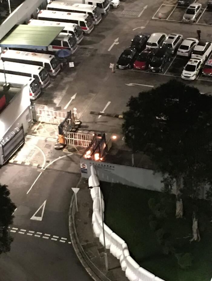 有網民攝到警署 被投擲汽油彈後, 閘口火光熊熊。