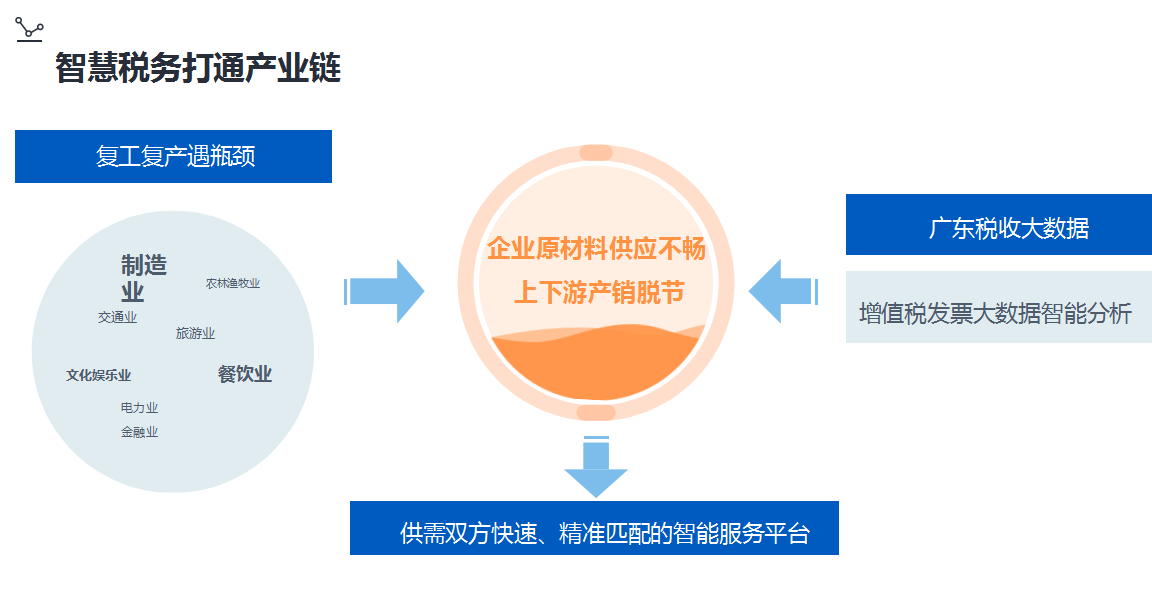 廣東省稅務局通過對發票中的原材料商品名稱信息進行語義分析、智能分詞與模糊匹配,對供應商的產能產量、信用評級、需求強度、風險因素等信息進行綜合計算,並結合用戶的需求進行優先級匹配排序,實現供需關係「精準配」。