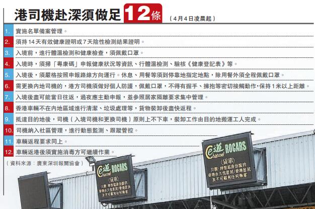 據上述要求,深圳報關協會發出通告,4月4日起,所有香港司機入境深圳時,須持有由香港特區政府發出的14天有效期內健康證明,或第三方檢測機構發出的7天內陰性核酸檢測結果證明。港府須向深圳市政府提供列明「保障香港正常生活物資供應和必要物資運輸」的跨境司機名單,如非名單內的司機入境須隔離14日。司機入境時須掃描「粵康碼」申報健康狀況、目的地、工作安排、活動等信息,經海關檢疫並確認核酸結果為陰性方可入境。惟本港衛生防護中心昨表明,不會發出健康證明。特區政府昨晚回應指,知悉深圳市政府有關建議,但仍未就具體執行細節或實施日期收到正式通報,會繼續與深圳商討和與業界保持緊密聯繫,確保跨境貨運物流正常運作。