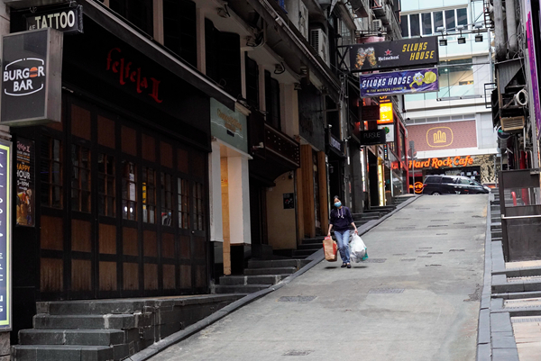 中環酒吧區蘭桂坊昨日完全沒有酒吧營業, 人流稀疏, 形同「死城」。記者馮俊文攝