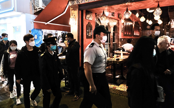 酒吧暫停营業措施昨晚6 時生效後,當局人員聯同警方到尖沙咀一帶酒吧及餐廳巡查。中通社