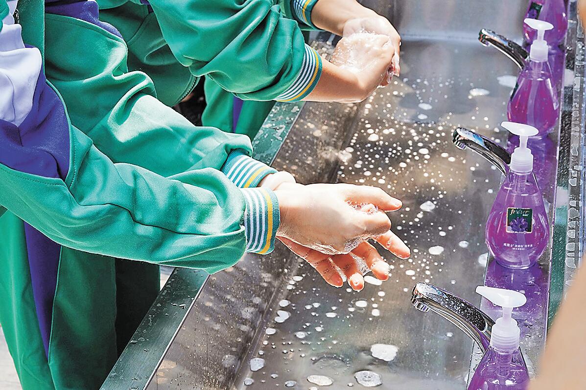 廣州組織小學開展疫情防控應急處置演練,同 學們在老師的指導下認真洗手。
