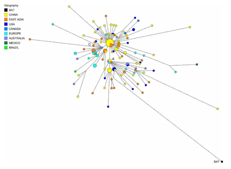 最近,剑桥大学研究人员发表在《美国科学院院刊》(PNAS)上一篇针对新冠病毒溯源的研究发现,目前全球感染的新冠病毒实际上并非是同一种,而是变异分化成A、B、C三种类型,并且这三种类型的病毒在全球分布范围不同。