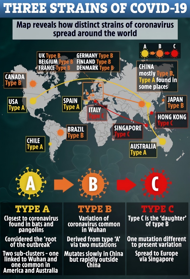 研究结果认为,A型病毒与蝙蝠和穿山甲中发现的病毒关系最密切,研究人员将其描述为疫情暴发的根源。B型病毒由A型衍生而来,被两个突变分开,然后C型反过来又是B型的“女儿”。