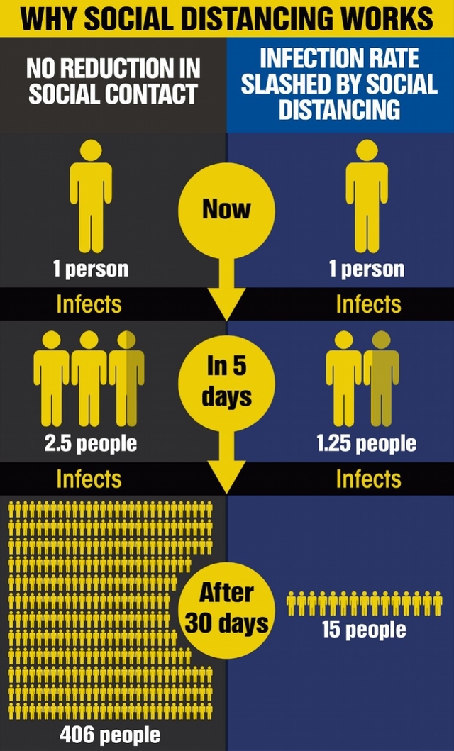 采取“社交隔离”能有效抑制病毒传播(左边为毫无措施传播速度,右边为采取措施传播速度)