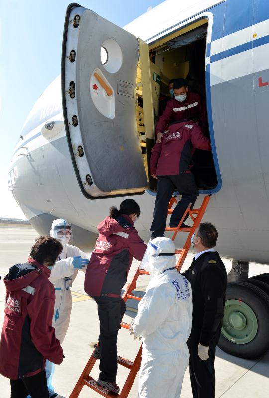 中國政府赴俄羅斯抗疫醫療專家組成員登機 徐旭/攝
