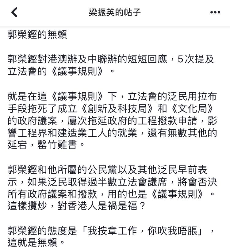 梁振英指,郭榮鏗對港澳辦及中聯辦回應中,5次提及立法會的《議事規則》。而就是在這《議事規則》下,泛民用「拉布」手段拖死了成立創新及科技局和文化局的政府議案,屢次拖延政府的工程撥款申請,影響工程界和建造業工人的就業,及無數其他的延宕,形容是罄竹難書。