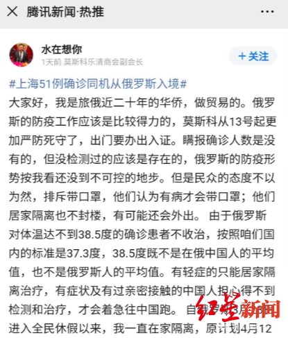 尽管上海疾控部门已经做出了得当安排。但这架飞机上的60名确诊病例,还是引起了公众对于俄罗斯输入疫情的担忧。4月13日,曾搭乘SU208航班的一名乘客告诉红星新闻记者,这架航班上多为在俄华商,主要来自莫斯科萨达沃和柳布利诺两个市场。