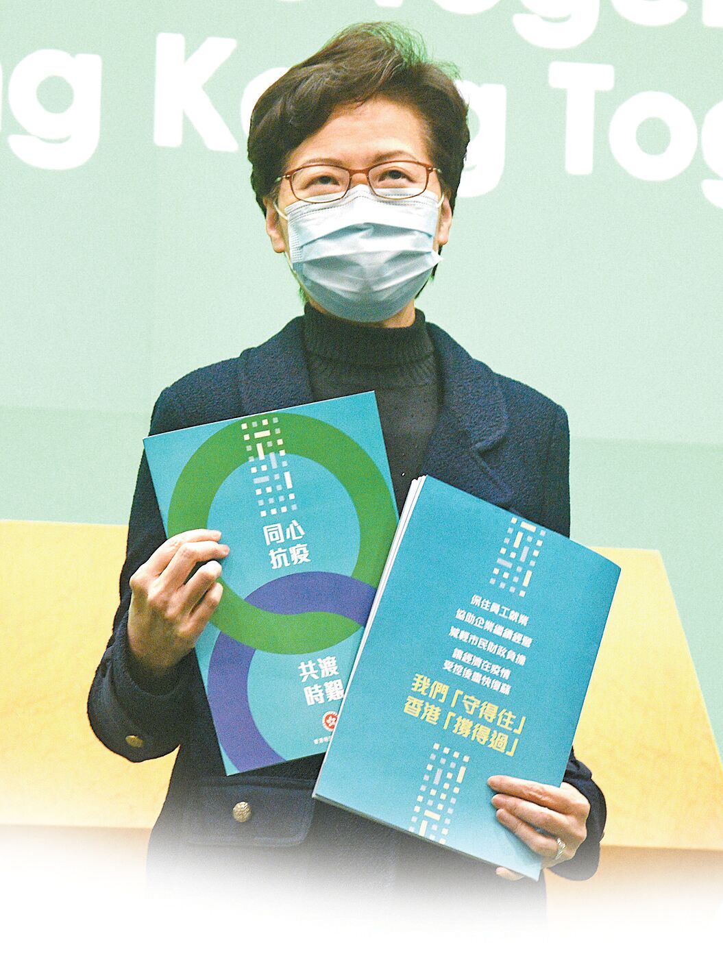 林鄭月娥昨日在政府總部手持「我們『守得住』,香港『撐得過』」小冊子出場,並向在場傳媒展示。她表示,這本小冊子是為特區政府推出的支援措施而製作,希望有份領取人士能夠掌握相關措施,而小冊子內容將會放到網上供市民查閱。她隨後在開場發言中表示,自上周三公布一系列措施支援受疫情影響的個人和企業後,她聽到最多的反應是「快」,很多人都希望政府可盡快落實措施。