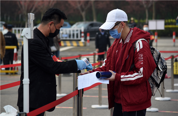 內地陸續開學復課,作為人群聚集場所,校園防疫備受關注。圖為昨日山東省臨沂市郯城第一中學,工作人員為返校復課的高三學生測溫消毒(無人機照片)。新華社