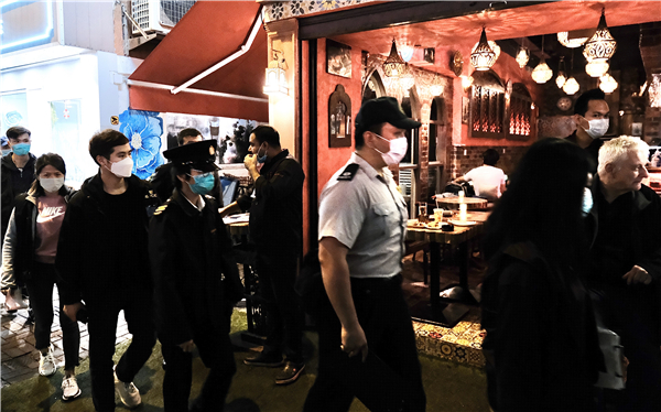 限聚令實施後,警方近期忙於在酒吧區巡查。中新社