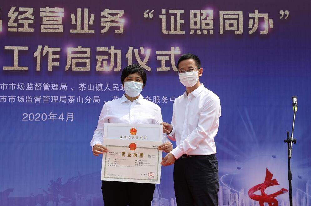 當天,新政落地後的首張營業執照現場頒發給了茶山一餐飲店。據該店主李女士介紹,2019年第一家餐飲店開業前,要先領營業執照,再辦食品經營許可證,按流程「證照」到手大概用了10天;今次「證照同辦」僅填寫一套材料,20分鐘「證照」同時到手,程序簡便,效率更快。