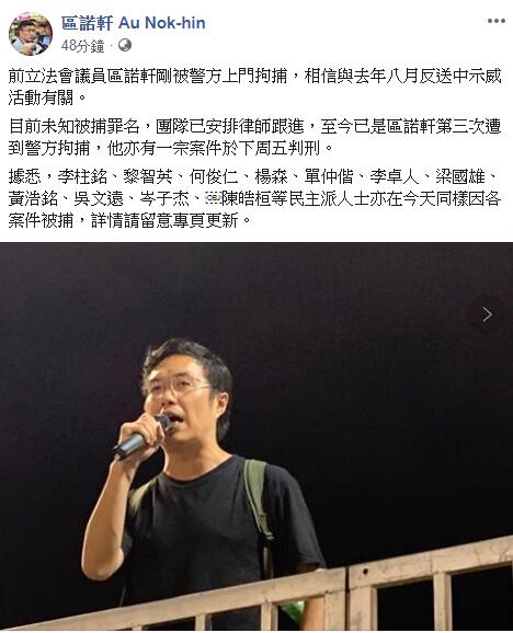 區諾軒FB專頁早上發文,指區被警方上門拘捕,相信與去年八月「反送中」示威活動有關。目前未知被捕罪名,團隊已安排律師跟進,專頁指至今是區諾軒第三次遭到警方拘捕,他亦有一宗案件於下周五判刑。專頁又指民主黨元老李柱銘、民主黨立法會議員何俊仁亦同遭拘捕。