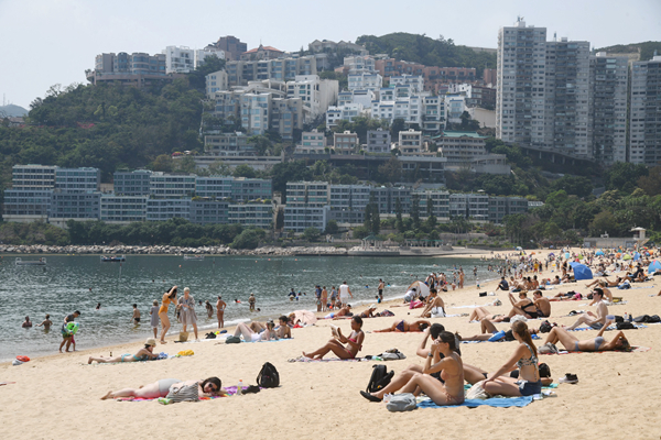 走到港島淺水灣,在艷陽高掛下,弄潮和曬太陽的市民將淺水灣擠得滿滿(上圖)。有人攜同年幼子女到來散心,有人帶同愛犬閒逛,亦有女士穿上比堅尼提早展示一身古銅色膚色。疫情下一景是有弄潮及日光浴市民仍堅持戴口罩。此外,有警員在沙灘執勤及派單張,呼籲聚集人士不要違反「限聚令」。