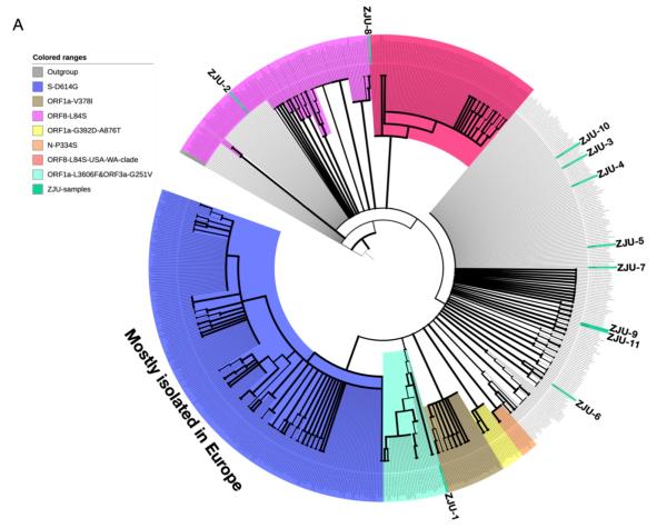 研究人员将11株病毒分离株整合到系统发育分析中,它们分散在整个系统发育空间中。ZJU-1与ORF1a-L3606F和ORF3a-G251V组聚类,它同时具有这两种典型的突变。另一方面,ZJU-2与ZJU-8和ORF8-L84S聚类,它们都有两个始祖突变。由于上述T22303G突变,ZJU-9和ZJU-11与澳大利亚的一个分离株聚类。其他毒株则或者突变较少,或者没有与任何已知的大规模群体聚集的新突变,这反映了这11个样本的广泛多样性。