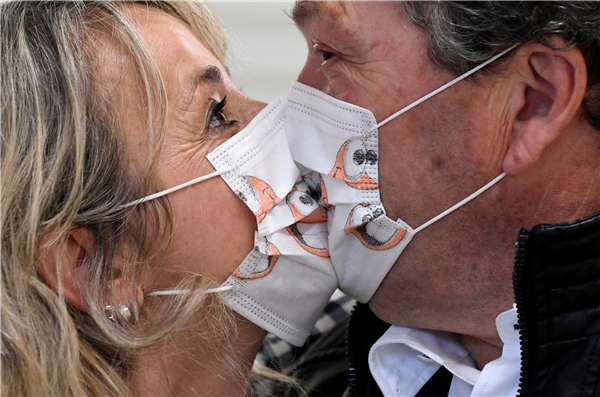 在意大利帕西卡加,一對新人在22日舉行婚禮後,隔着口罩親吻。由於當地仍實施限居令,整個婚禮並沒有賓客,只有律師見證人出席。 路透社
