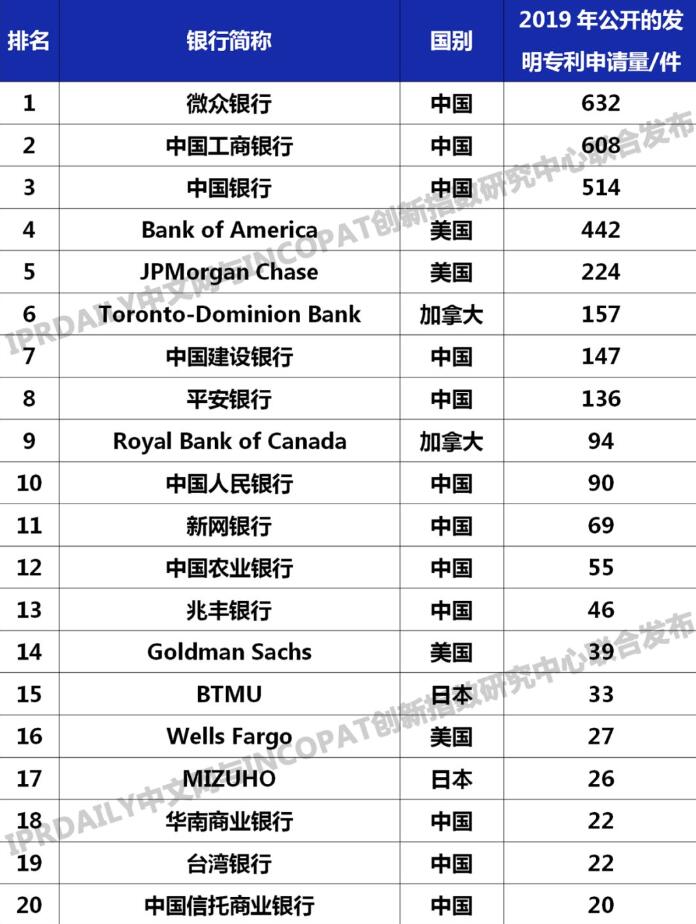 【香港商報网訊】記者黃裕勇報道:4月23日,具有全球影響力的知識產權媒體IPR Daily正式發佈2019年全球銀行發明專利排行榜(Top100),微眾銀行以632件專利申請量成功躍居首位。