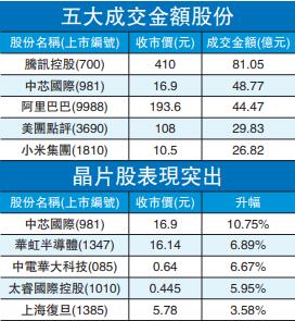 科網股及晶片股表現突出。中芯國際(981)計劃登陸內地科創板,大力發展晶片,股價收市飆10.7%;華虹半導體(1347)亦跟升6.9%。