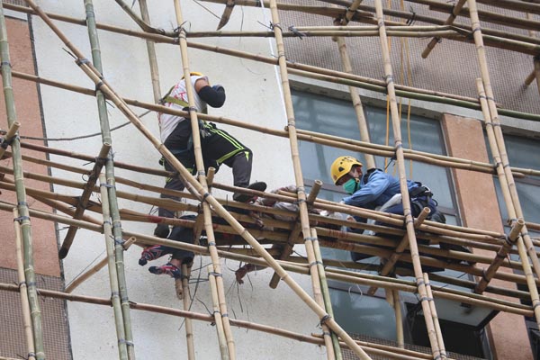 消防員爬出棚架檢查工人傷勢。 記者 區天海攝