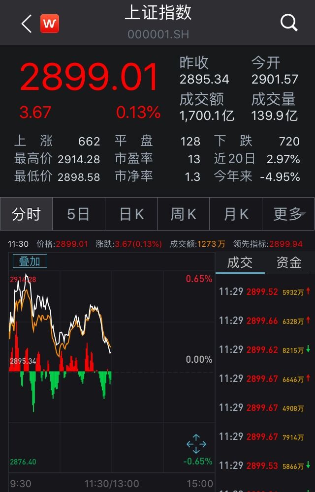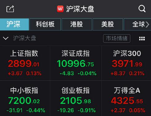 截至午间收盘,沪指报2899.01点,涨幅0.13%,成交量1700.12亿元;深成指报10996.75点,跌幅0.04%,成交量2584.14亿元;创业板指报2105.98点,跌幅0.91%;上证50指数报2880.31点,涨幅0.25%。