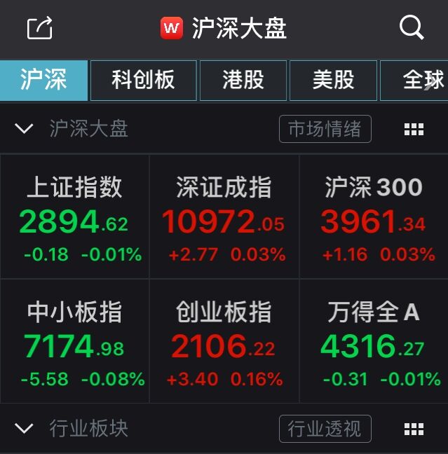 【香港商报网讯】12日,沪深两市开盘涨跌不一,沪指报2894.62点,跌幅0.01%;深成指报10972.05点,涨幅0.03%;创业板指报2106.22点,涨幅0.16%;上证50指数2871.31点,跌幅0.02%;沪深300报3961.34点,涨幅0.03%。