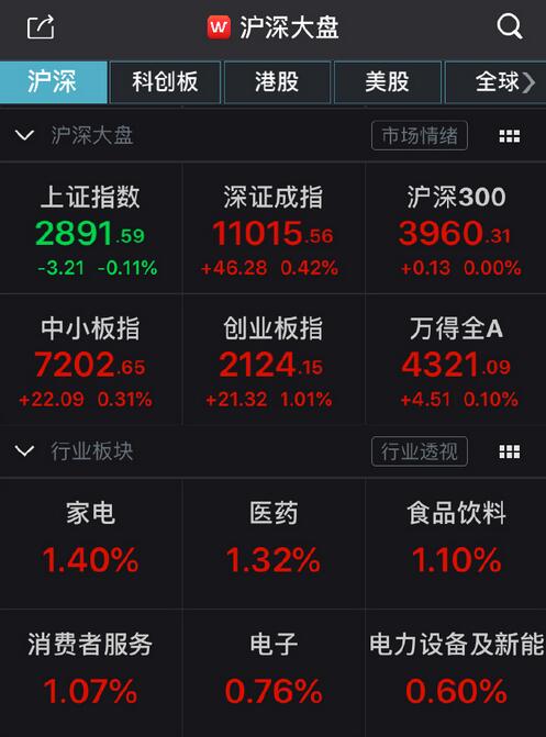 具体来看,截止收盘,沪指报2891.56点,跌0.11%,成交额为2385亿元(上一交易日成交额为2719亿元);深成指报11015.56点,涨0.42%,成交额为3609亿元(上一交易日成交额为4128亿元);创指报2124.15点,涨1.01%,成交额为1197亿元(上一交易日成交额为1332亿元)。