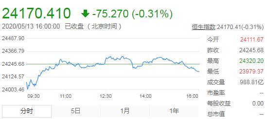 【香港商报网讯】5月13日,星期三、农历四月廿一。隔夜美股尾盘跳水,今日港股以24111点低开,随后走出一波震荡盘升走势,午后,消息面较为淡静,投资者担心外围市场继续走弱,恒生指数走出一波震荡下行走势。截至收盘,恒生指数(24180.3, -65.38, -0.27%)跌0.27%,报24180.30点;红筹指数涨0.11%,国企指数涨0.04%。