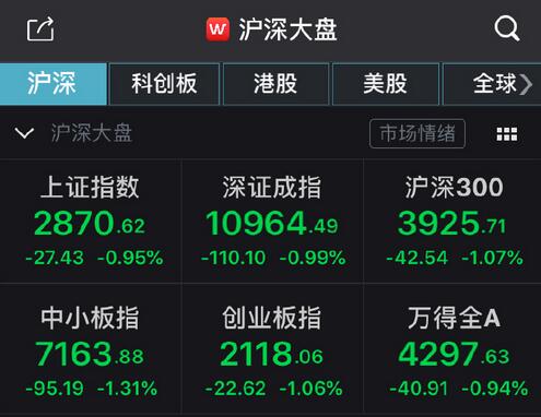 【香港商报网讯】两市今日低开低走,全天表现低迷。截至发稿,沪指报跌0.96%,深成指跌1.02%;创指跌1.08%。