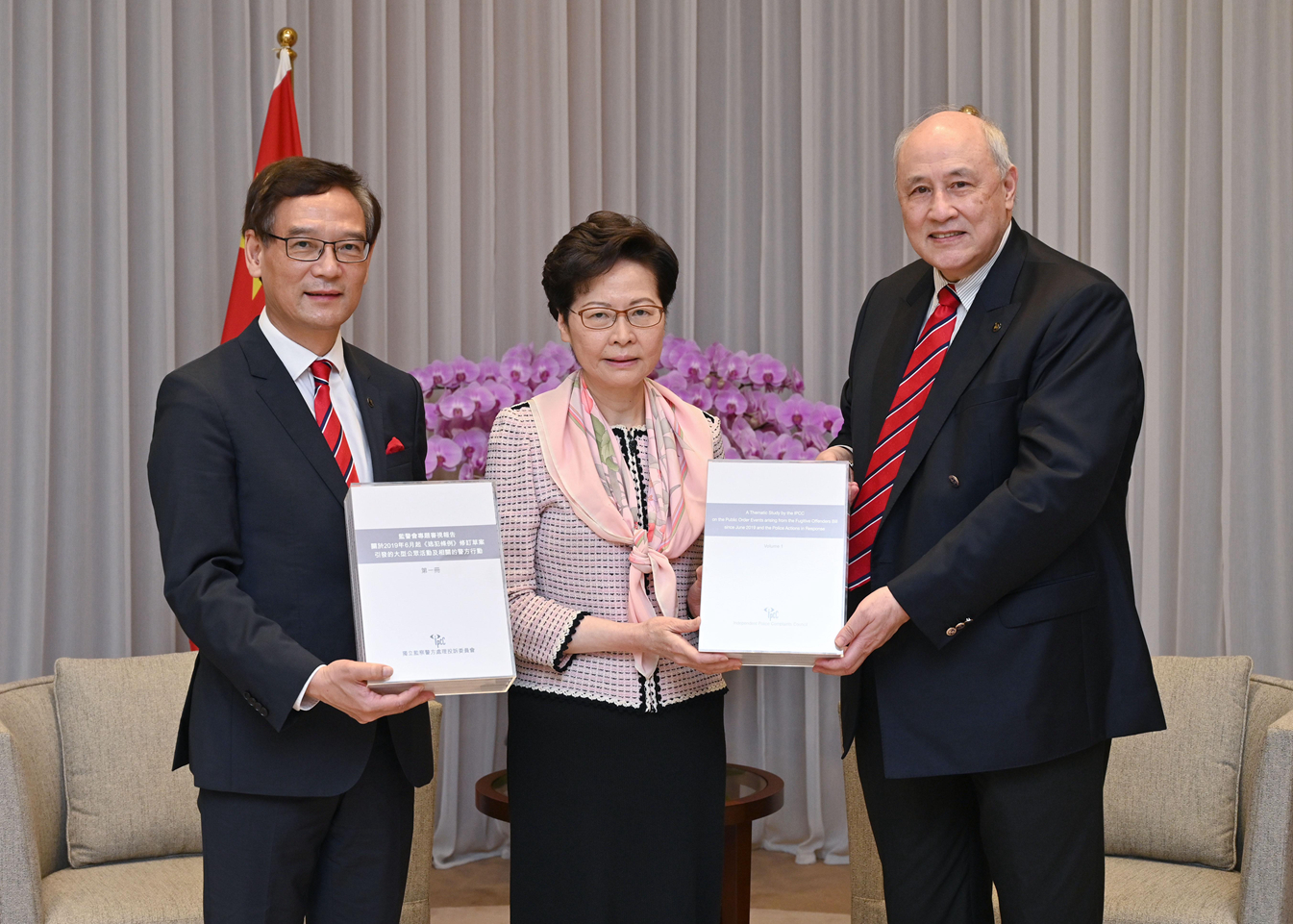 林鄭月娥(中)昨日收到監警會主席梁定邦(右)和副主席謝偉銓提交關於修例風波的專題審視報告。政府新聞處