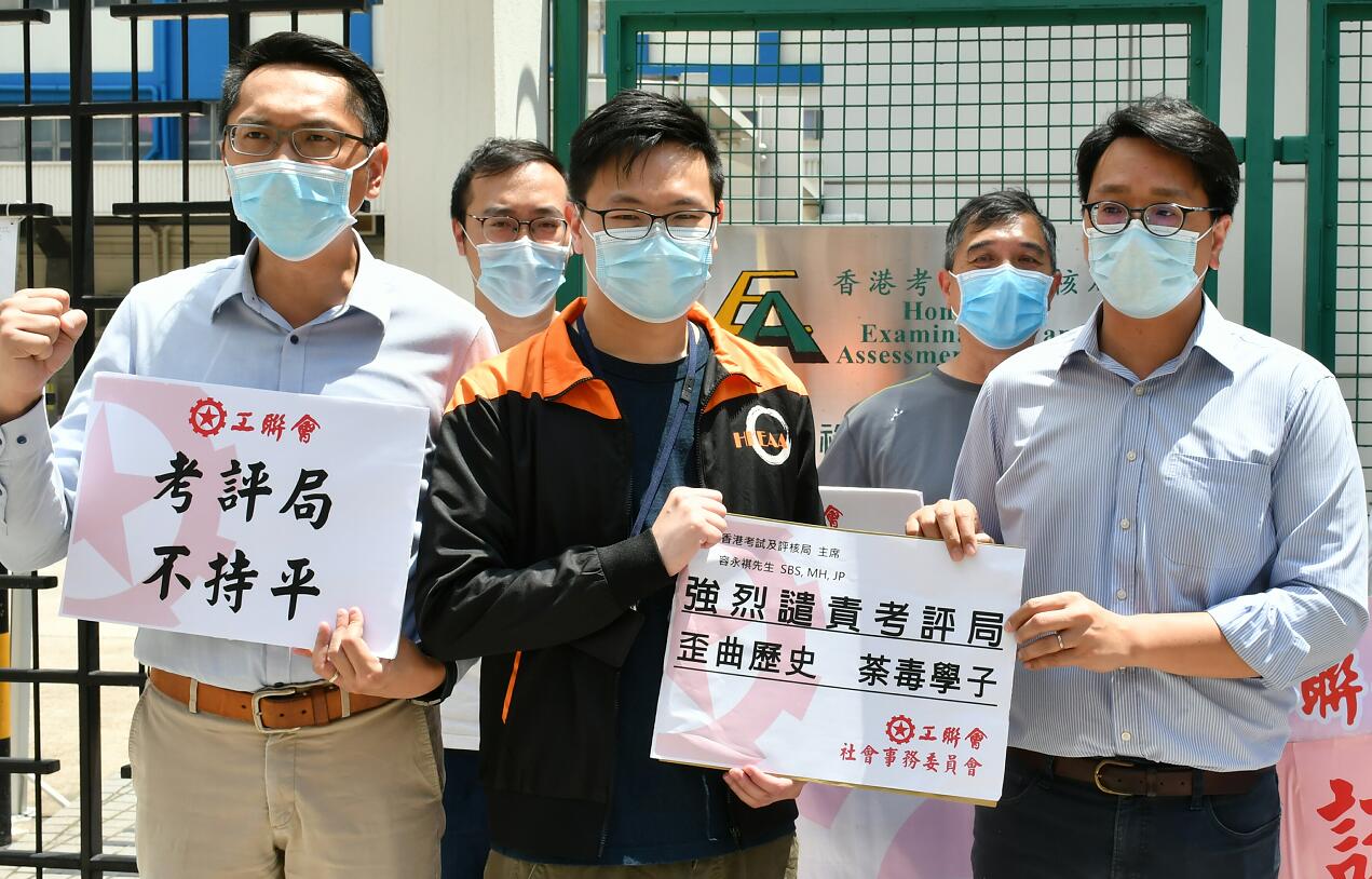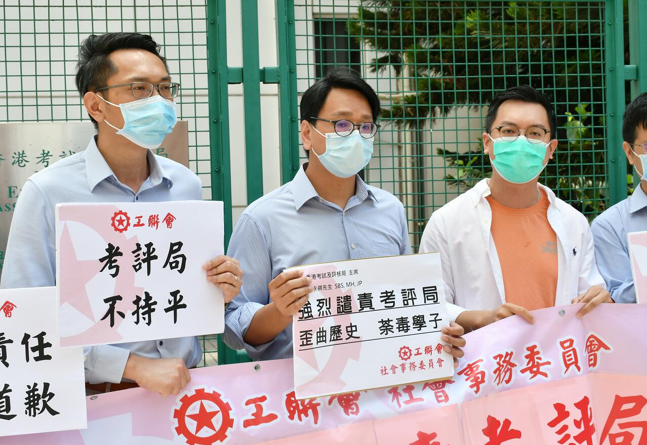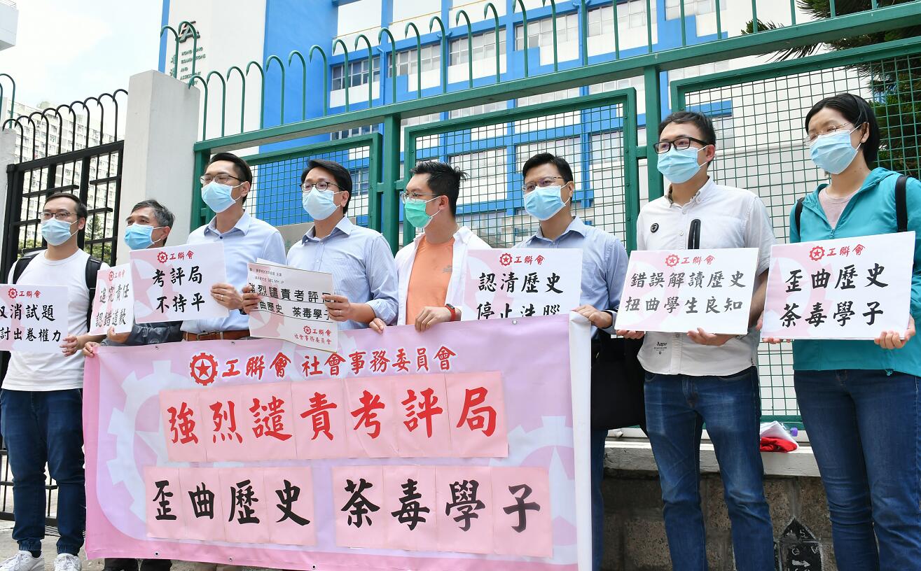 工聯會社會事務委員會一眾成員手持道具及標語,並高呼「認清歷史 停止洗腦」、「考評局 不持平」及「取消試題 檢討出卷權力」等口號,對考評局在文憑試歷史科目中出題出現偏頗深感遺憾,要求追究考評局失職等責任。